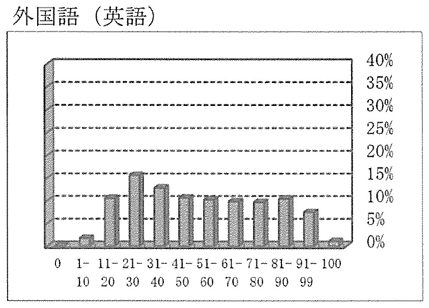 昨年度より平均点は上がりましたが、5教科の中では平均点が低めに出ています。得点分布を見ると、11点~50点の区間に49.5%が集中しています。この分布からは読み取れませんが、英語は偏差値が高い高校は高得点に、低い高校は低得点に集まる傾向が強い教科です。高校間で一番差がつきやすい教科とも言えます。